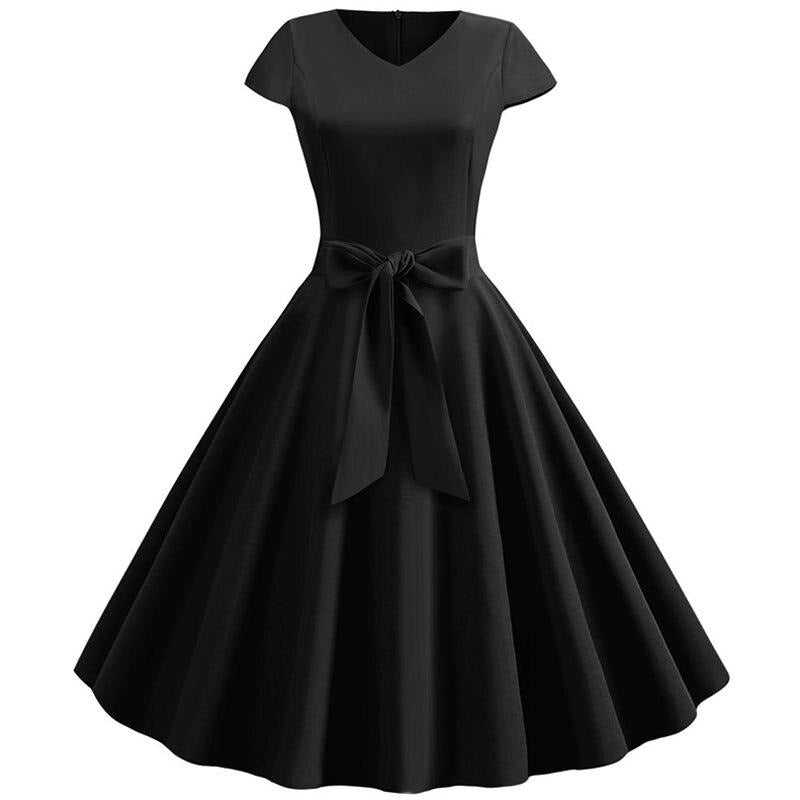Adopta un estilo chic y atemporal con este Vestido Pin Up Negro, perfecto para salir a cenar o para una noche de fiesta. Su versátil color negro lo hace adecuado para cualquier ocasión, tanto de día como de noche. Con su elegante escote y sus mangas cortas, este vestido mostrará tu feminidad con estilo.